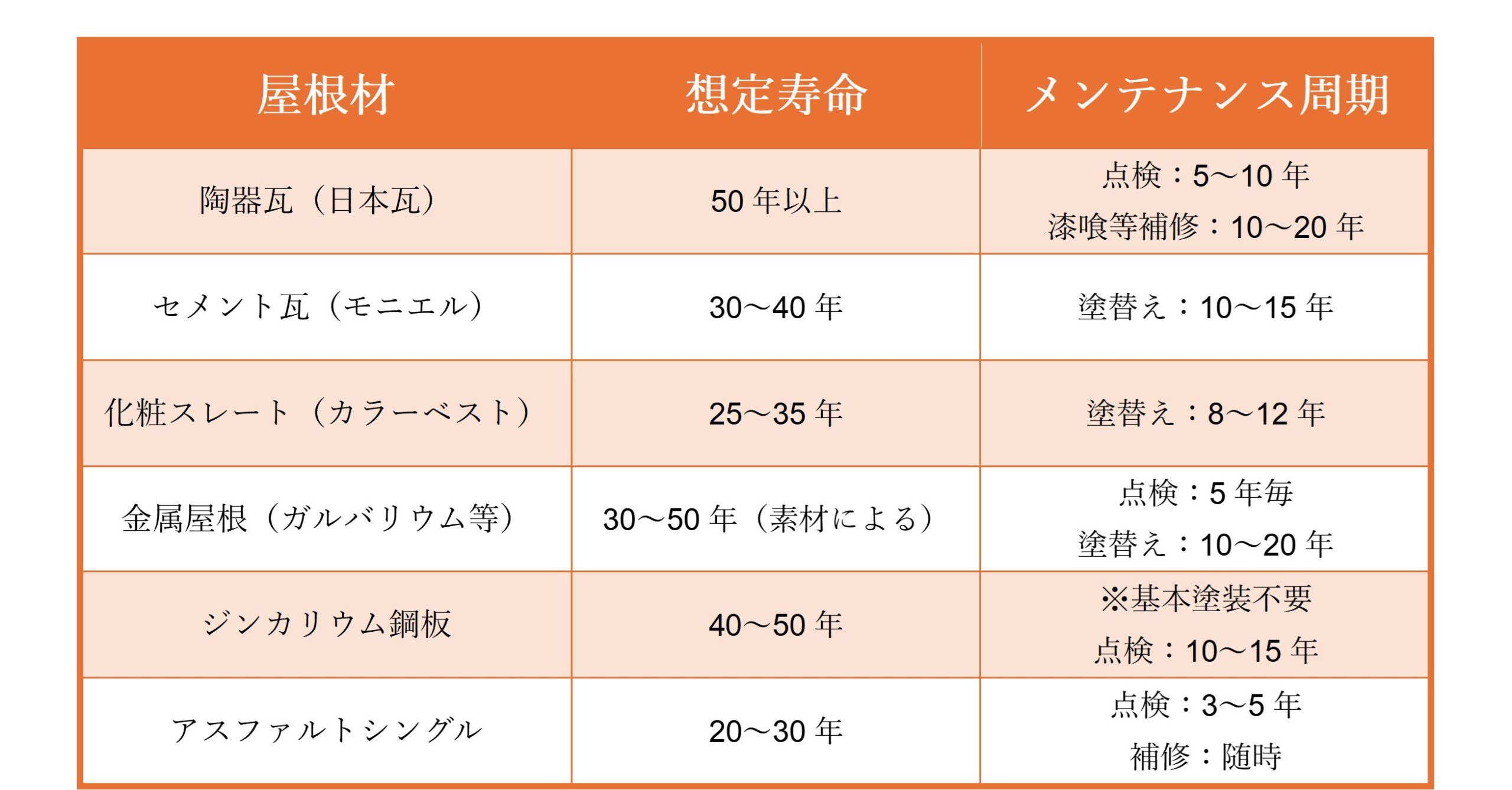 特に、金属屋根とスレート屋根はメンテナンス周期が短く、定期的な塗装・点検が寿命を大きく伸ばします。