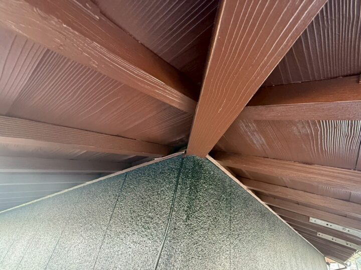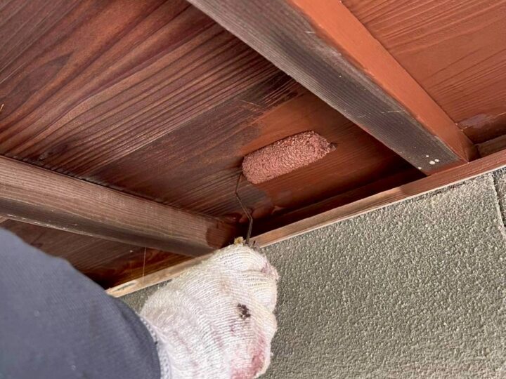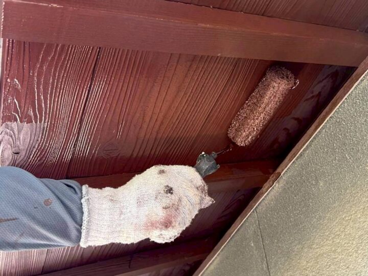 木部専用塗材(キシラデコールコンゾラン)を使用して、希望色のウォルナットを2回塗りで仕上げます軒天垂木塗装