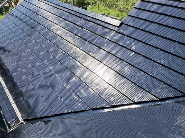 中塗り塗料と同じ色を塗っていきます。屋根塗装