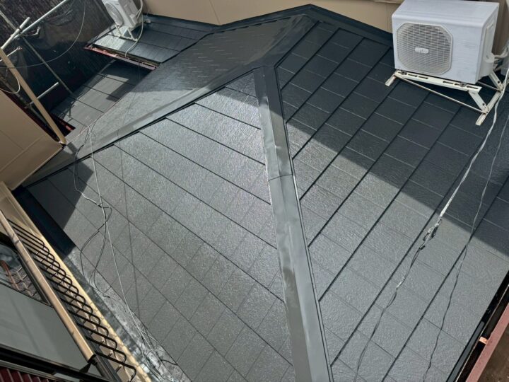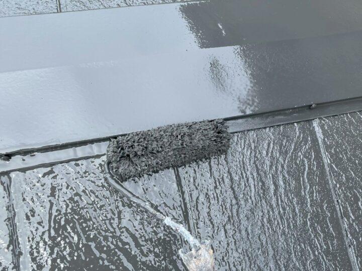 中塗り塗料と同じ色を塗っていきます。屋根塗装
