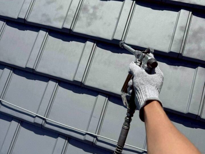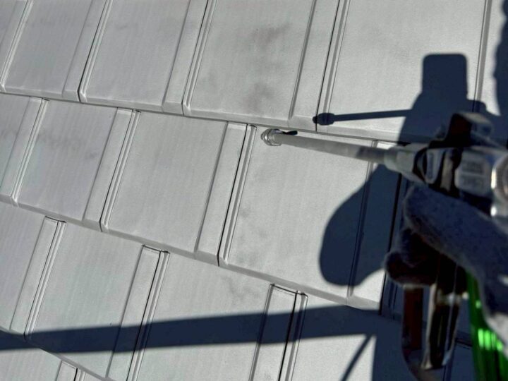日本瓦専用塗材(いぶしコート)を2回、吹き付けていきます