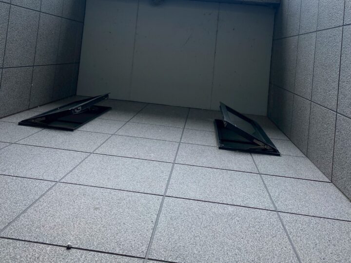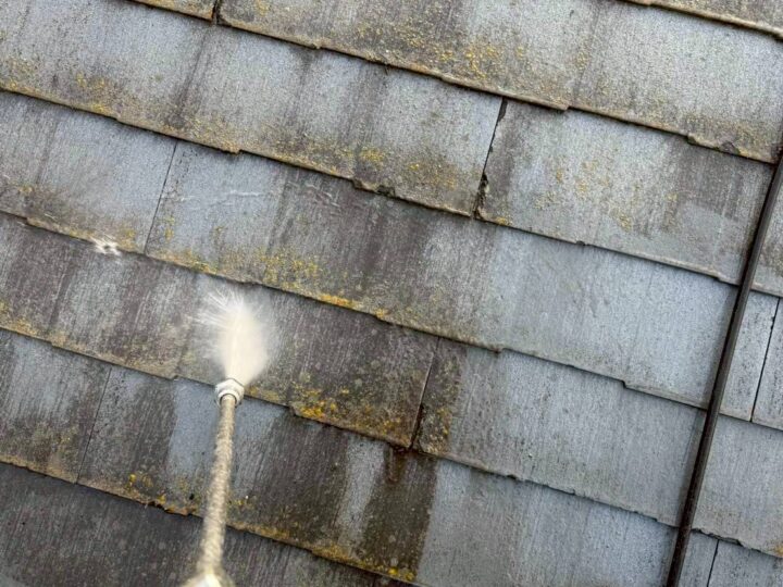 塗料の密着性が良くなるように、付着しているコケや藻・劣化した塗料などの汚れを落とします。